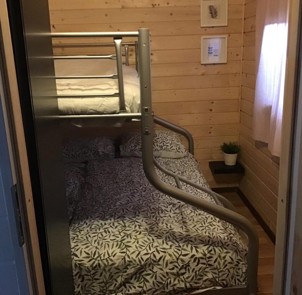 2 slaapkamers: slaapkamer met 2p bed, 160m x 1.90m en een slaapkamer met een stapelbed met een 2 persoons onderkant 140 x 190 bovenbed is 90 x 190.