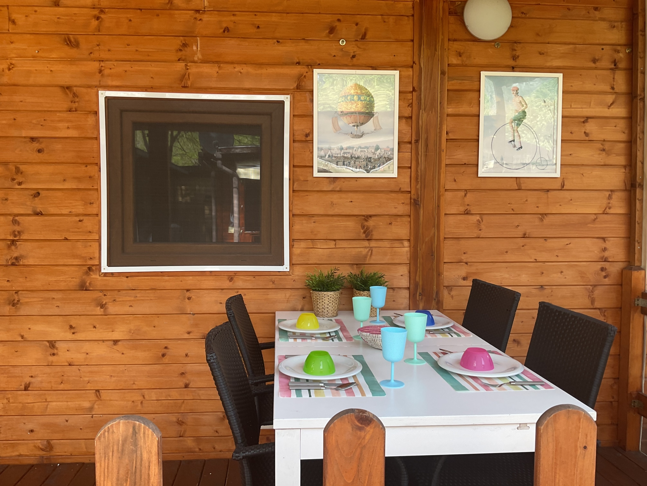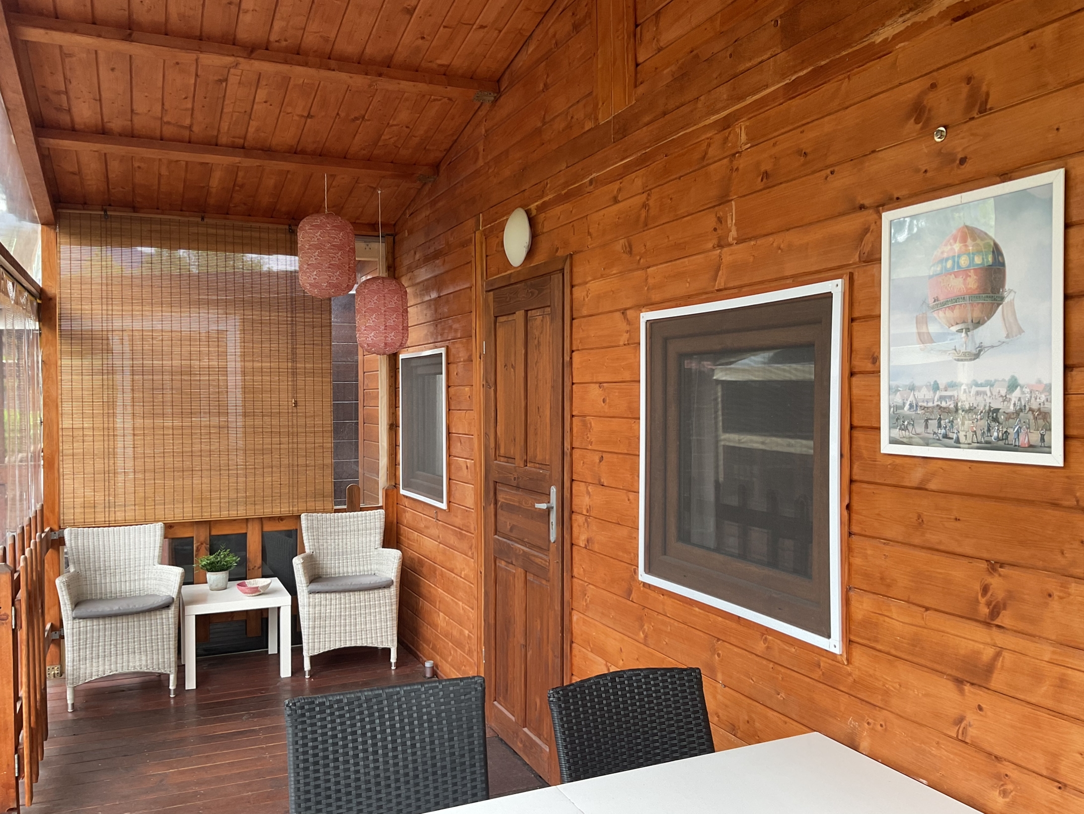 Afsluitbaar zeil, tafel met 5 stoelen, 2 lekkere rietenstoelen en buitenverlichting.