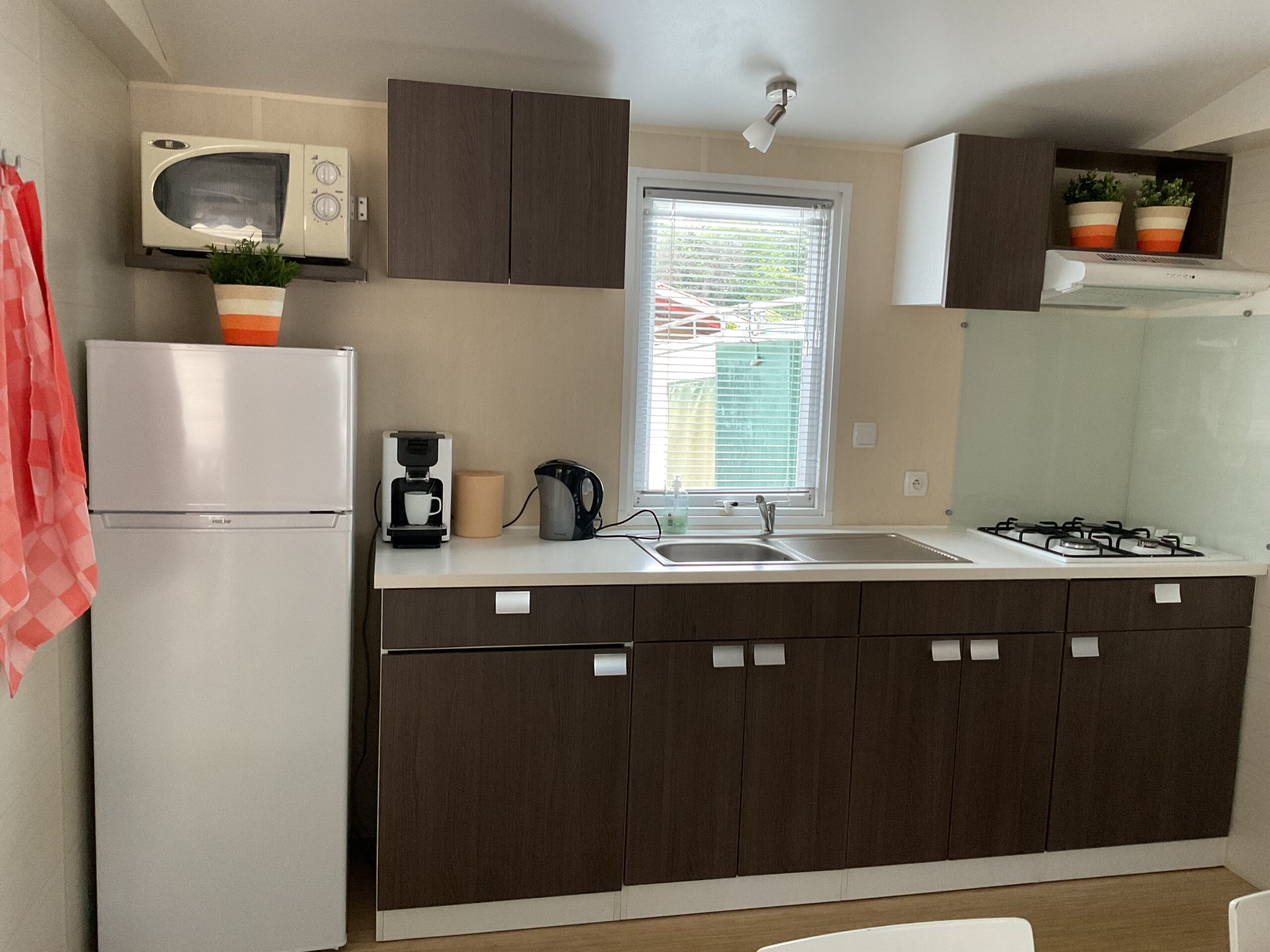 Met een vierpitskookplaat, koffiezetapparaat, senseoapparaat, koelkast met grote vriezer, volledige inventaris.